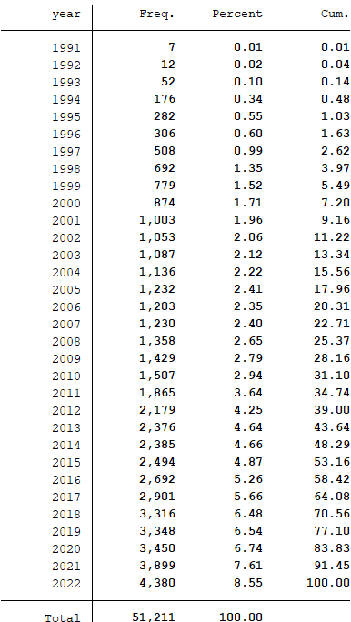 样本选择:全部A股1991-2022年数据(初始数据的起点为1990年,经过处理之后的数据起点为1991年)