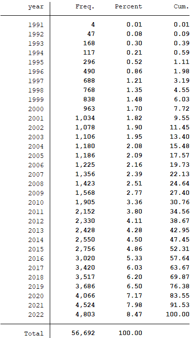样本选择:全部A股1991-2022年数据(初始数据是从1990年开始,经过处理之后的数据起点为1991年)