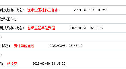 ccjiakai 发表于 2023-6-30 14:40 你这个是省级单位刚送出去,全国社科规划办还没有受理,估计下个月初受理,下个月末有结果