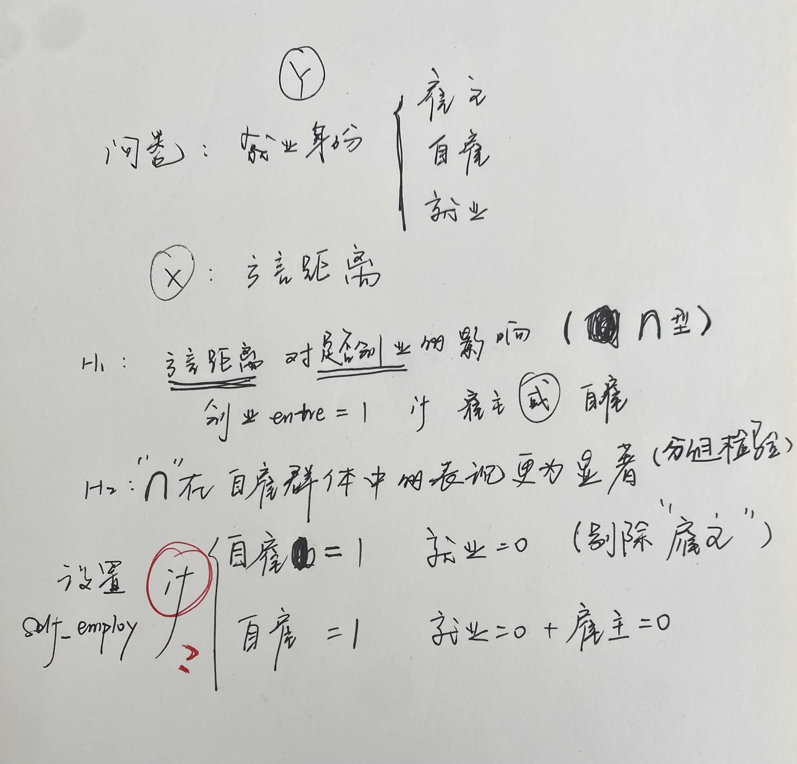 mlogit y(y=1雇主, y=0自雇,y=-1就业) x方言距离,y=1组得到的系数就是方言距离造成的雇主和自雇之间的差异,y=-1组得到的系数就是方言距离造成的就业于自雇之间的差异,y的3种情况可以任选一种作为基准