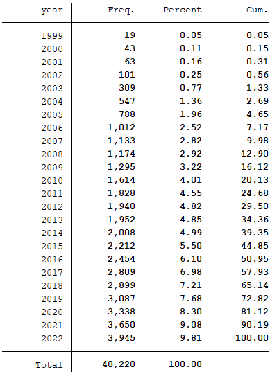 样本选择:全部A股1999-2022年数据(“董事长与总经理兼任情况”在数据库中是从1999年开始,所以数据起点为1999年)