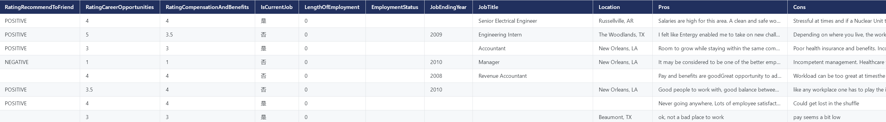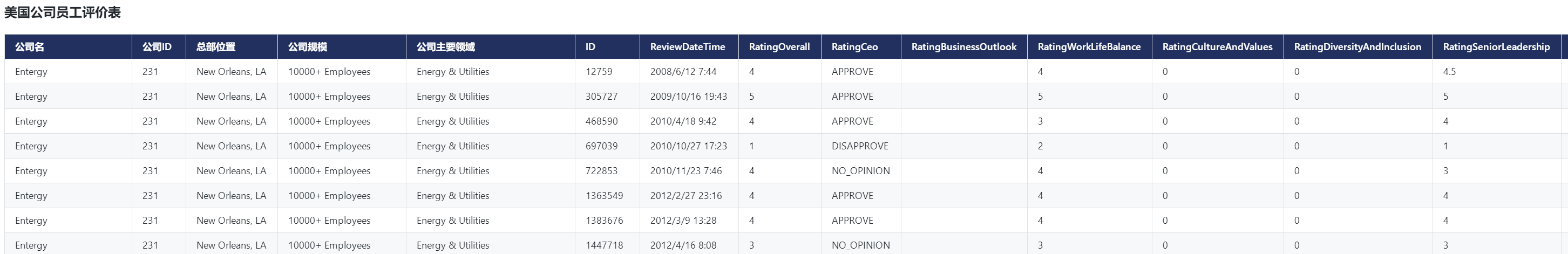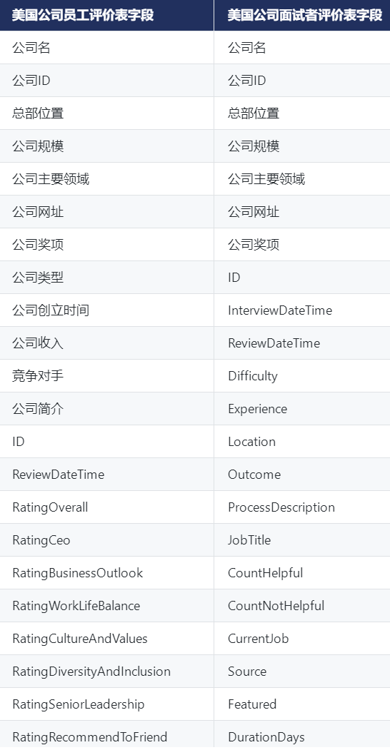 ,分为员工评价和面试者评价2张表,包含美国公司员工及面试者对雇主的评价(包括对工作、公司、环境的满意度),以及薪酬福利、文化价值观、企业展望、是否推荐等多方面指标。