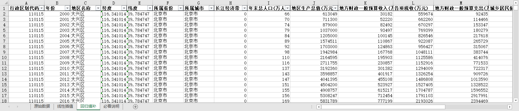 excel数据文件包原始数据(由于多年度指标不同存在缺失值)、线性插值、回归填补三个版本,提供您参考使用。