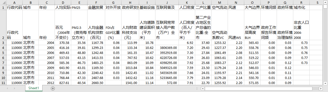 行政代码 城市 年份 百元(2004年不变价) PM2.5(微克每立方米) 人均金融机构贷款(百元) FDI占GDP比重(%) 人均财政科技支出(元) 人均道路建设面积(平方米) 互联网宽带接入用户数(万户)全市 人口密度(百人/平方千米) 第二产业占地区生产总值的比重-全市 空气流动系数VC 风速WS 大气边界层高度BLH ZF工作报告环境词频 ZF环境治理指标 非农人口比重2004-2008