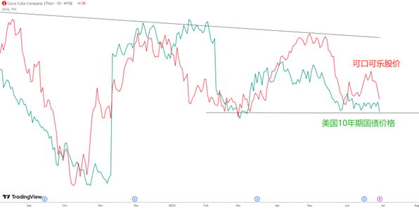 即便如此,IARC7月份的决定也将对可口可乐等商业公司产生巨大的负面影响,短期内对股价的压力极大。如果可口可乐公司迫于舆论压力更换配方,很可能重演2015年百事可乐的一波三折。不仅如此,最近加息预期不断攀升,对必须消费品板块不利。由图可见,可口可乐的股价与美国10年期国债价格走势存在明显的正相关性。在利率上涨,美元升值的周期中,可口可乐的股价短期内有较大的回调压力。不过这也将是长线投资者的机会,股价下方的第一支撑要看58-58.5附近