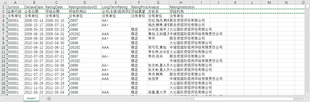 证券代码        公告日期        评级日期        评级机构ID        公司(主体)信用评级        评级展望        分析员        评级机构