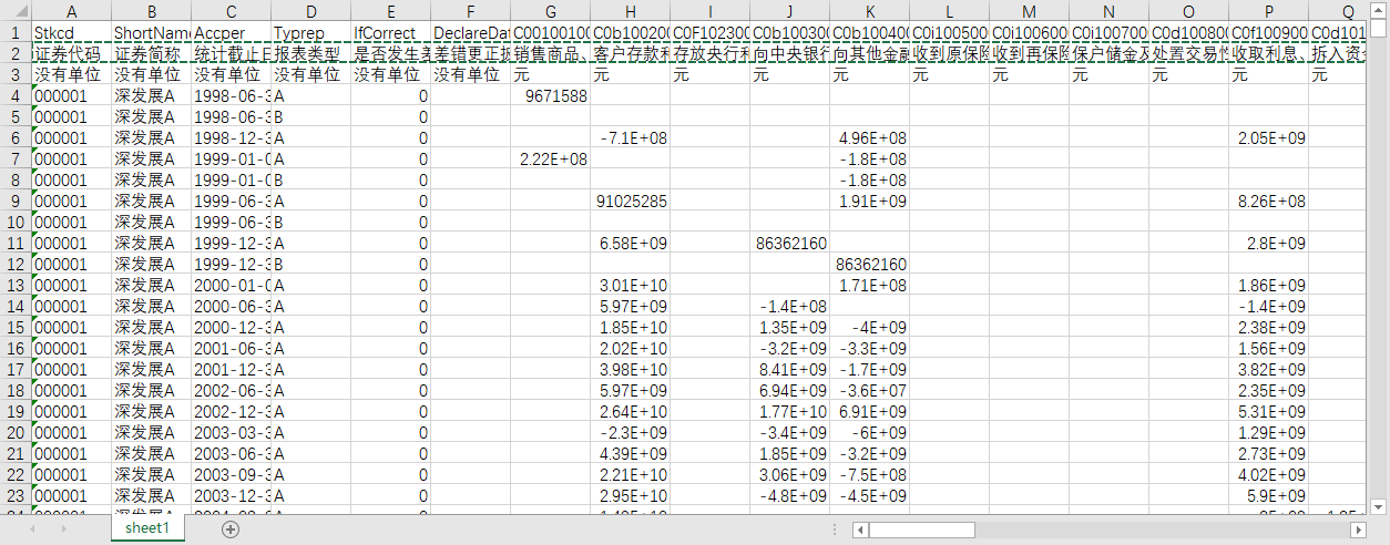 证券代码 证券简称 统计截止日期 报表类型 是否发生差错更正 差错更正披露日期 销售商品、提供劳务收到的现金 客户存款和同业存放款项净增加额 存放央行和同业款项净减少额 向中央银行借款净增加额 向其他金融机构拆入资金净增加额 收到原保险合同保费取得的现金 收到再保险业务现金净额 保户储金及投资款净增加额 处置交易性金融资产净增加额 收取利息、手续费及佣金的现金 拆入资金净增加额 回购业务资金净增加额 拆出资金净减少额 买入返售款项净减少额 收到的税费返还 收到的其他与经营活动有关的现金 经营活动现金流入小计 购买商品、接受劳务支付的现金 客户贷款及垫款净增加额 向中央银行借款净减少额 存放中央银行和同业款项净增加额 支付原保险合同赔付款项的现金 支付利息、手续费及佣金的现金 支付再保业务现金净额 保户储金及投资款净减少额 拆出资金净增加额 买入返售款项净增加额 拆入资金净减少额 卖出回购款项净减少额 支付保单红利的现金 支付给职工以及为职工支付的现金 支付的各项税费 支付其他与经营活动有关的现金 经营活动现金流出小计 经营活动产生的现金流量净额 收回投资收到的现金 取得投资收益收到的现金 处置固定资产、无形资产和其他长期资产收回的现金净额 处置子公司及其他营业单位收到的现金净额 收到的其他与投资活动有关的现金 投资活动产生的现金流入小计 购建固定资产、无形资产和其他长期资产支付的现金 投资支付的现金 质押贷款净增加额 取得子公司及其他营业单位支付的现金净额 支付其他与投资活动有关的现金 投资活动产生的现金流出小计 投资活动产生的现金流量净额 吸收投资收到的现金 吸收权益性投资收到的现金 其中:子公司吸收少数股东投资收到的现金 发行债券收到的现金 取得借款收到的现金 收到其他与筹资活动有关的现金 筹资活动现金流入小计 偿还债务支付的现金 分配股利、利润或偿付利息支付的现金 其中:子公司支付给少数股东的股利、利润 支付其他与筹资活动有关的现金 筹资活动现金流出小计 筹资活动产生的现金流量净额 汇率变动对现金及现金等价物的影响 其他对现金的影响 现金及现金等价物净增加额 期初现金及现金等价物余额 期末现金及现金等价物余额