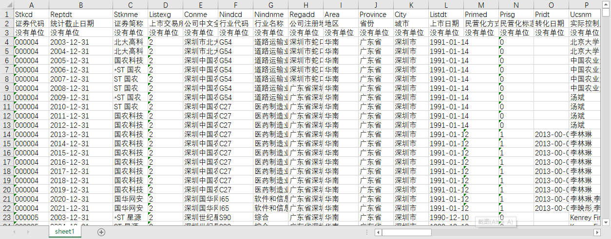 证券代码 统计截止日期 证券简称 上市交易所 公司中文全称 行业代码 行业名称 公司注册地址 地区 省份 城市 上市日期 民营化方式 民营化标志 转化日期 实际控制人名称 实际控制人类型 实际控制人控制上市公司方式 实际控制人是否担任董事长或总经理 实际控制人拥有上市公司控制权比例(%) 实际控制人拥有上市公司所有权比例(%) 总股数 未流通股总数 已流通股总数 股东总数 股东大会召开次数 董事会会议次数 监事会会议次数 年度股东大会出席会议的股东及股东代表个数 年度股东大会出席股份总数 年度股东大会出席率(%) 员工人数 离退休职工人数 董事会人数 其中:独董人数 监事会人数 董事长与总经理兼任情况 委员会设立总数 其中:四委设立个数 其中:其他委员会设立个数 持有本公司股份的董事总人数 持有本公司股份的监事人数 未领取薪酬董事人数 未领取薪酬监事人数 董事长持股数量 董事长持股比例(%) 监事会主席持股数量 监事会主席持股比例(%) 总经理持股数量 总经理持股比例(%) 董事前三名薪酬总额 高管前三名薪酬总额 流动资产 流动负债 总资产 股东权益(不含少数股东权益) 营业收入 净利润 扣除非经常性损益后的净利润 经营活动产生的现金流量净额 净资产收益率(%) 每股收益 每股净资产 调整后每股净资产 市盈率 市净率 实际控制人背景 控制链图
