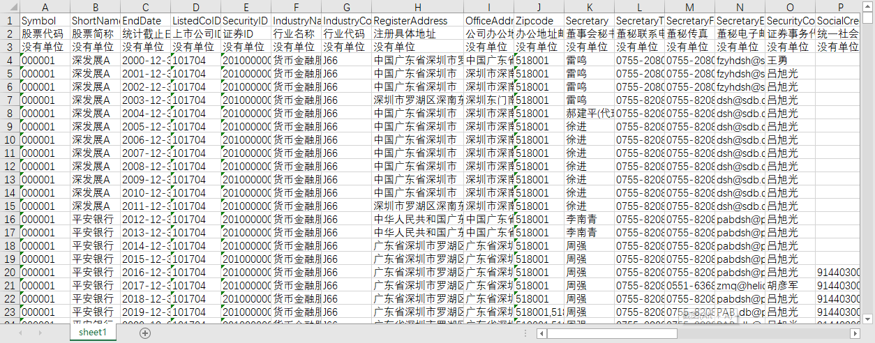 股票代码 股票简称 统计截止日期 上市公司ID 证券ID 行业名称 行业代码 注册具体地址 公司办公地址 办公地址邮政编码 董事会秘书 董秘联系电话 董秘传真 董秘电子邮箱 证券事务代表 统一社会信用代码 重大变更 办公地经度 办公地纬度 ISIN编码 中文全称 法人代表 公司成立日期 ABH股交叉码 注册资本 公司网址 经营范围 注册地经度 注册地纬度 电子邮箱 首次上市日期 所属省份代码 所属省份 所属城市代码 所属城市 主营业务 上市状态