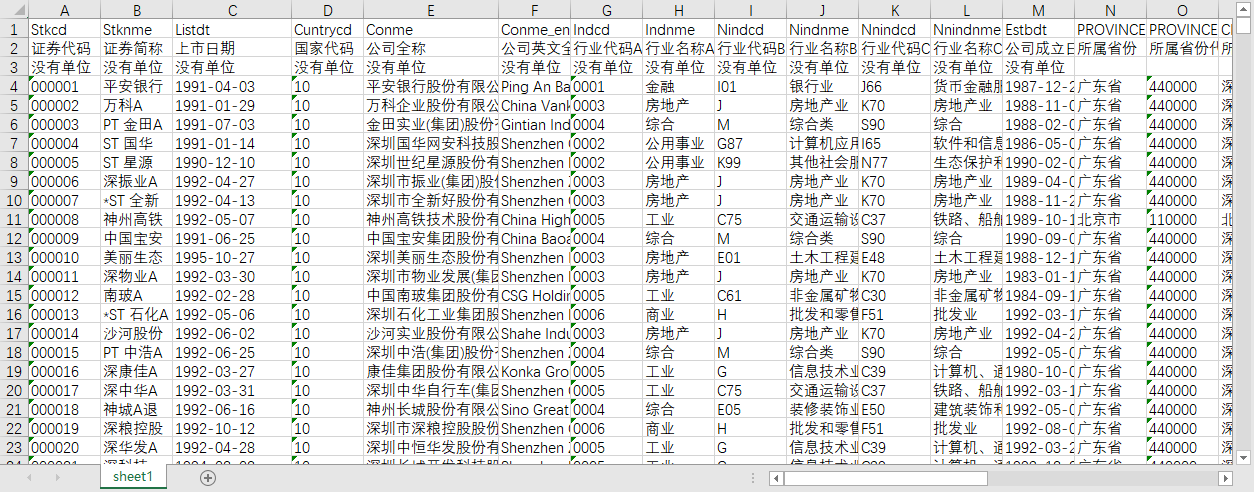 证券代码 证券简称 上市日期 国家代码 公司全称 公司英文全称 行业代码A 行业名称A 行业代码B 行业名称B 行业代码C 行业名称C 公司成立日期 所属省份 所属省份代码 所属城市 所属城市代码 上市公司经营性质 上市公司经营性质编码 数据库zui早交易记录的日期 数据库中交易数据的计量货币 股票发行溢价 发行价格 发行价格的计量货币 发行数量 股票面值的计量货币 发行日期 股票面值 区域码 公司活动情况 AB股交叉码 情况变动日 H股交叉码 市场类型