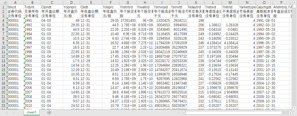 证券代码 交易年份 年开盘日期 年开盘价 年收盘日期 年收盘价 年个股交易股数 年个股交易金额 年个股流通市值 年个股总市值 年交易天数 考虑现金红利再投资的年个股回报率 不考虑现金红利再投资的年个股回报率 市场类型 最新股本变动日期 年盘后成交总量 年盘后成交总额