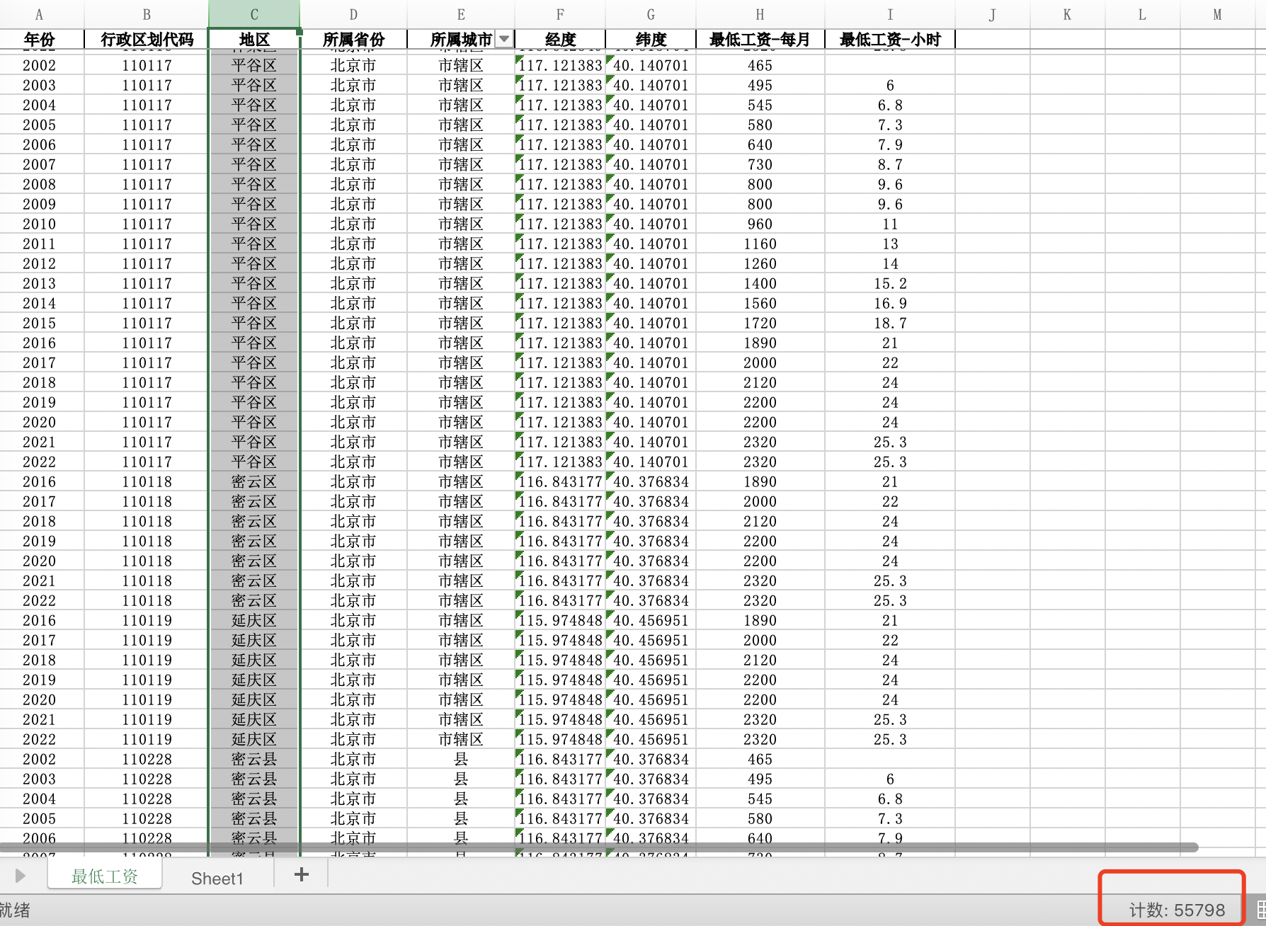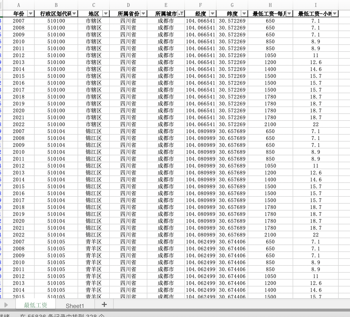 共计9个指标:年份、行政区划代码、地区、所属省份、所属城市、经度、纬度、最低工资-每月、最低工资-小时