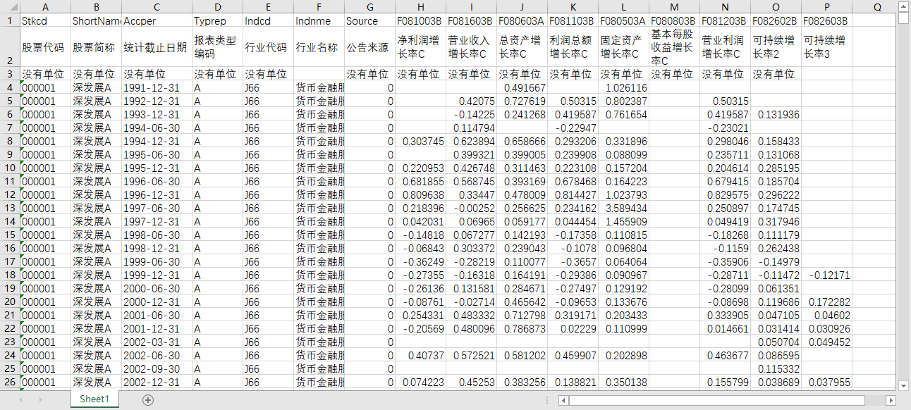 股票代码 股票简称 统计截止日期 报表类型编码 行业代码 行业名称 公告来源 净利润增长率C 营业收入增长率C 总资产增长率C 利润总额增长率C 固定资产增长率C 基本每股收益增长率C 营业利润增长率C 可持续增长率2 可持续增长率3