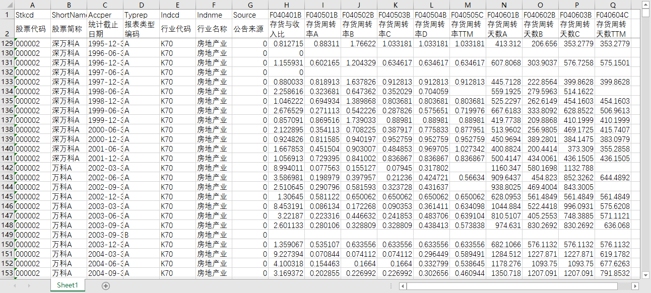 股票代码 股票简称 统计截止日期 报表类型编码 行业代码 行业名称 公告来源 存货与收入比 存货周转率A 存货周转率B 存货周转率C 存货周转率D 存货周转率TTM 存货周转天数A 存货周转天数B 存货周转天数C 存货周转天数TTM