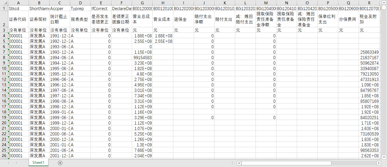 证券代码 证券简称 统计截止日期 报表类型 是否发生差错更正 差错更正披露日期 营业总成本 营业成本 退保金 赔付支出净额 赔付支出 减:摊回赔付支出 提取保险责任准备金净额 提取保险责任准备金 减:摊回保险责任准备金 保单红利支出 分保费用 税金及附加 业务及管理费 减:摊回分保费用 保险业务手续费及佣金支出 销售费用 管理费用 研发费用 财务费用 其中:利息费用(财务费用) 其中:利息收入(财务费用)