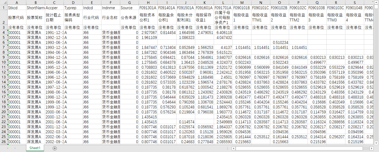 股票代码 股票简称 统计截止日期 报表类型编码 行业代码 行业名称 公告来源 每股资本公积1 每股盈余公积1 每股未分配利润1 每股留存收益1 归属于母公司每股净资产1 每股收益1 每股收益TTM1 每股收益2 每股收益TTM2 每股收益3 每股收益TTM3 每股收益4 每股收益TTM4
