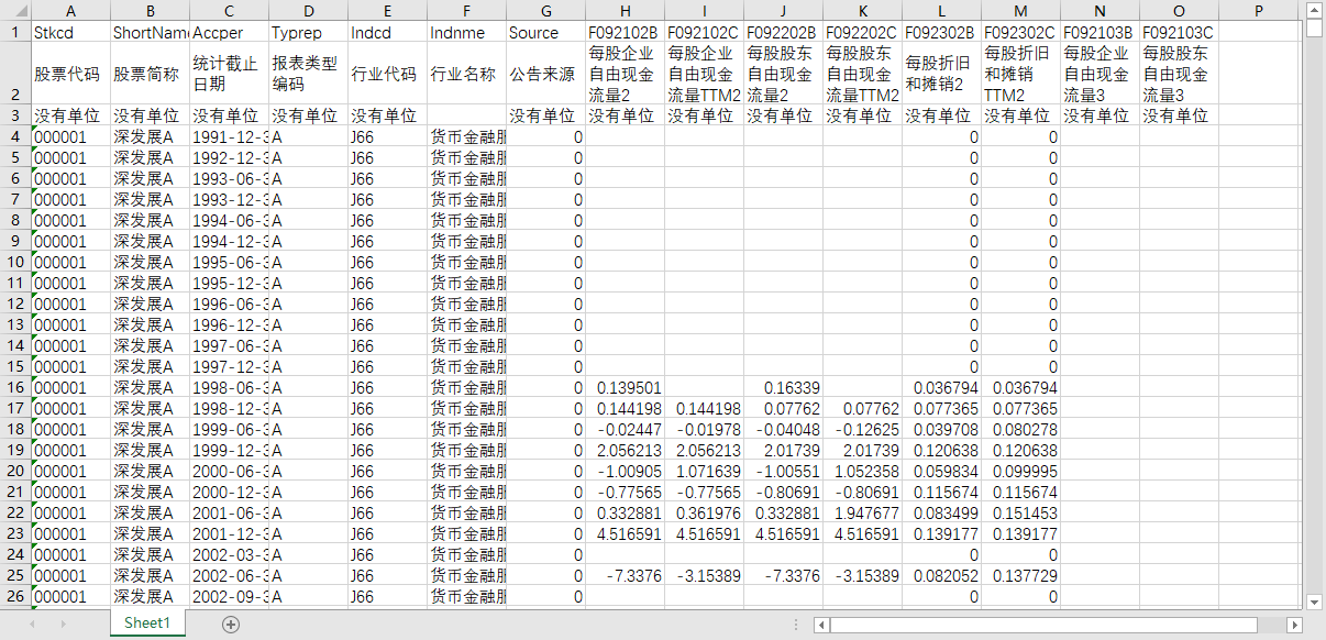 股票代码 股票简称 统计截止日期 报表类型编码 行业代码 行业名称 公告来源 每股企业自由现金流量2 每股企业自由现金流量TTM2 每股股东自由现金流量2 每股股东自由现金流量TTM2 每股折旧和摊销2 每股折旧和摊销TTM2 每股企业自由现金流量3 每股股东自由现金流量3