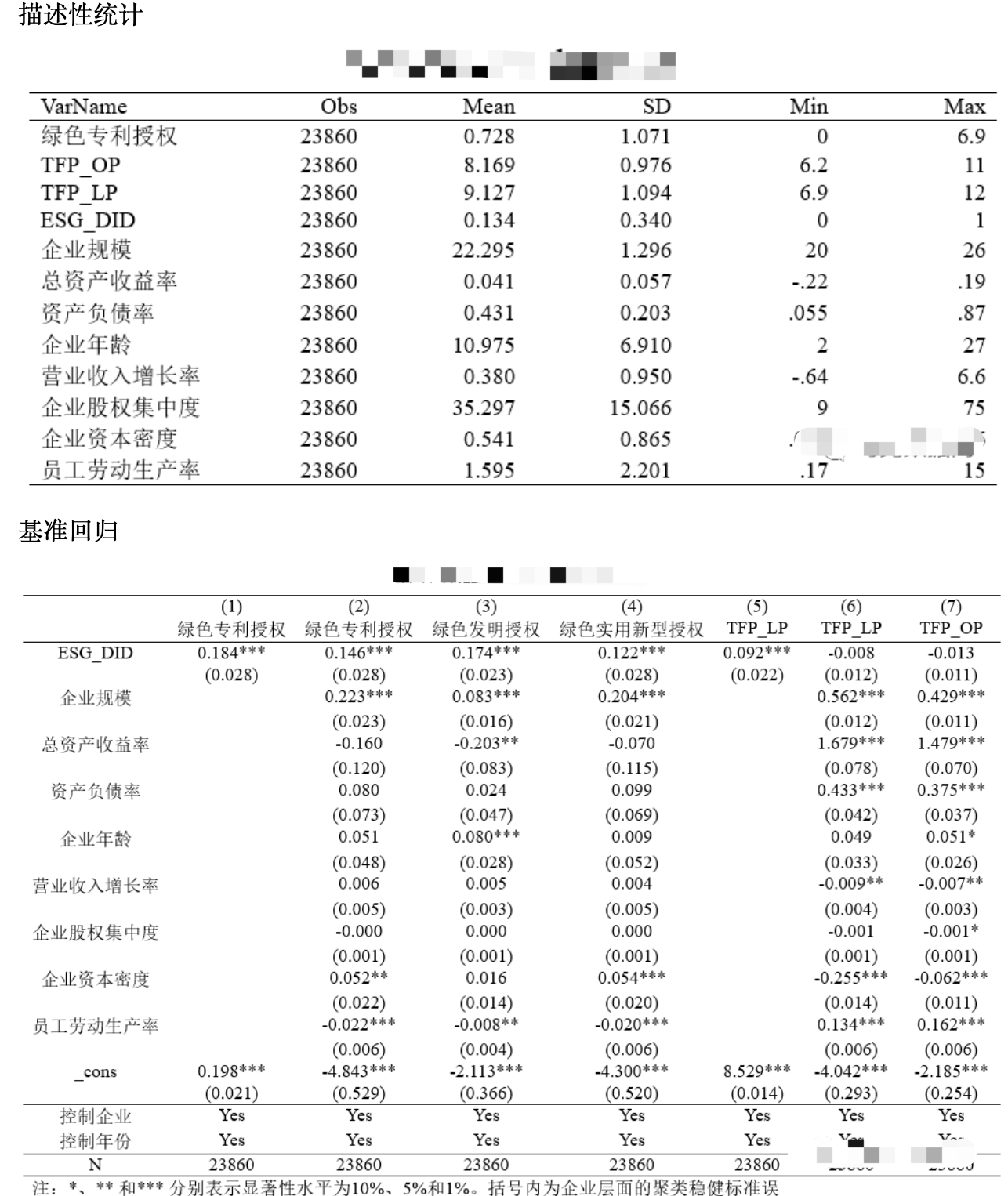 参照胡洁(2023)的做法,对来自数量经济技术经济研究《ESG评级能否促进企业绿色转型—基于多时点双重差分法的验证》一文中的基准回归部分进行复刻。