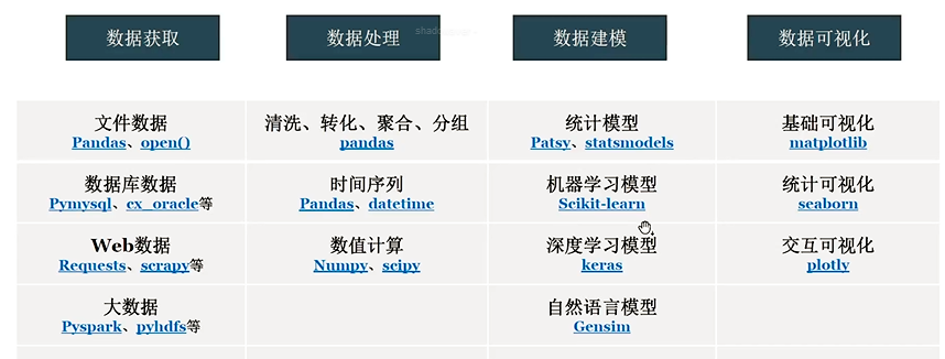 python常用模块分类,从数据获取 清洗 基本计算 统计建模 机器学习 深度学习,另外还有可视化模块,基本涵盖了统计建模的所需模块,做数据分析和