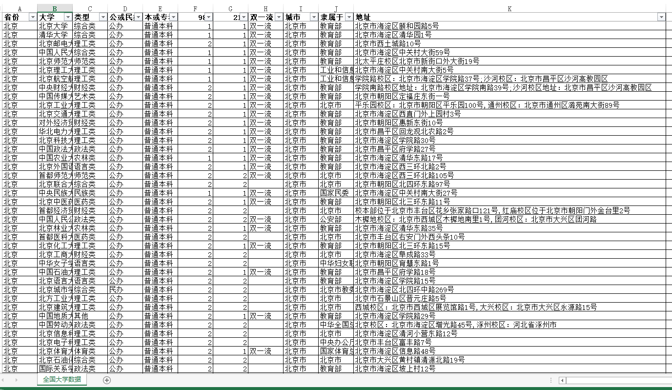 本数据为excel格式,既可以辅助志愿填报、查询相关信息,也可以对这些数据进行分析,对不同省份大学分布情况、公办民办大学分布情况、不同类型大学数量情况等等相关研究进行分析比较。