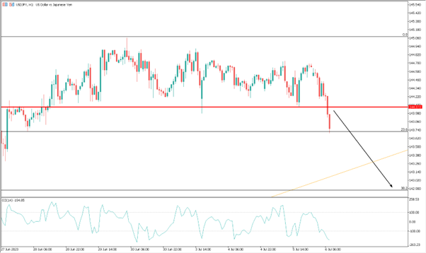 从美元兑日元一小时图来看,美日用大阴柱直接击穿了144的头部颈线,考虑到美元上涨阶段,日元更为强势的表现,短时间内释放的空头压力较强,应该关注颈线位置的回踩做空的机会。现价上方的关键阻力就是144大关,而上方144.7可以作为止损点位的参考。现价下方的支撑在斐波那契回调线143.7与142.8两个位置。如果美日保持动能持续下跌并突破支撑位,则有继续跟空的机会。持单时间由美日的下行动能决定。可以关注CCI趋势指标下穿-100线的空头信号。