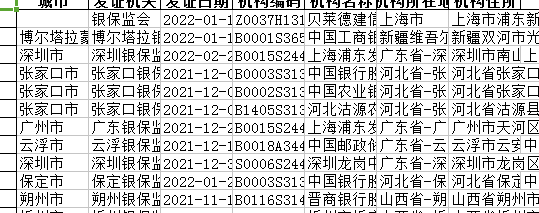 指标包括:城市、 发证机关 、发证日期、 机构编码 、机构名称、 机构所在地、 机构住所 、简称、 经度 流水号 、批准日期、 省份 、数据类型、 纬度 、业务范围、 英文名称、 邮政编码。