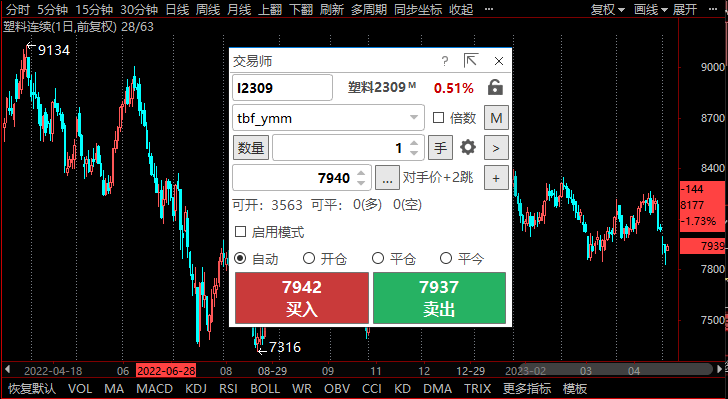 如上两图所示,连续指数与次连续指数不论是在行情报价上,还是在K线图表上均支持对其对应主力、次主力合约的交易。这一特性如何提升看盘效率呢?