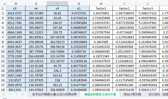 数据包括:原始数据,熵值法(权重,逐项得分),主成分测算过程以及最终结果