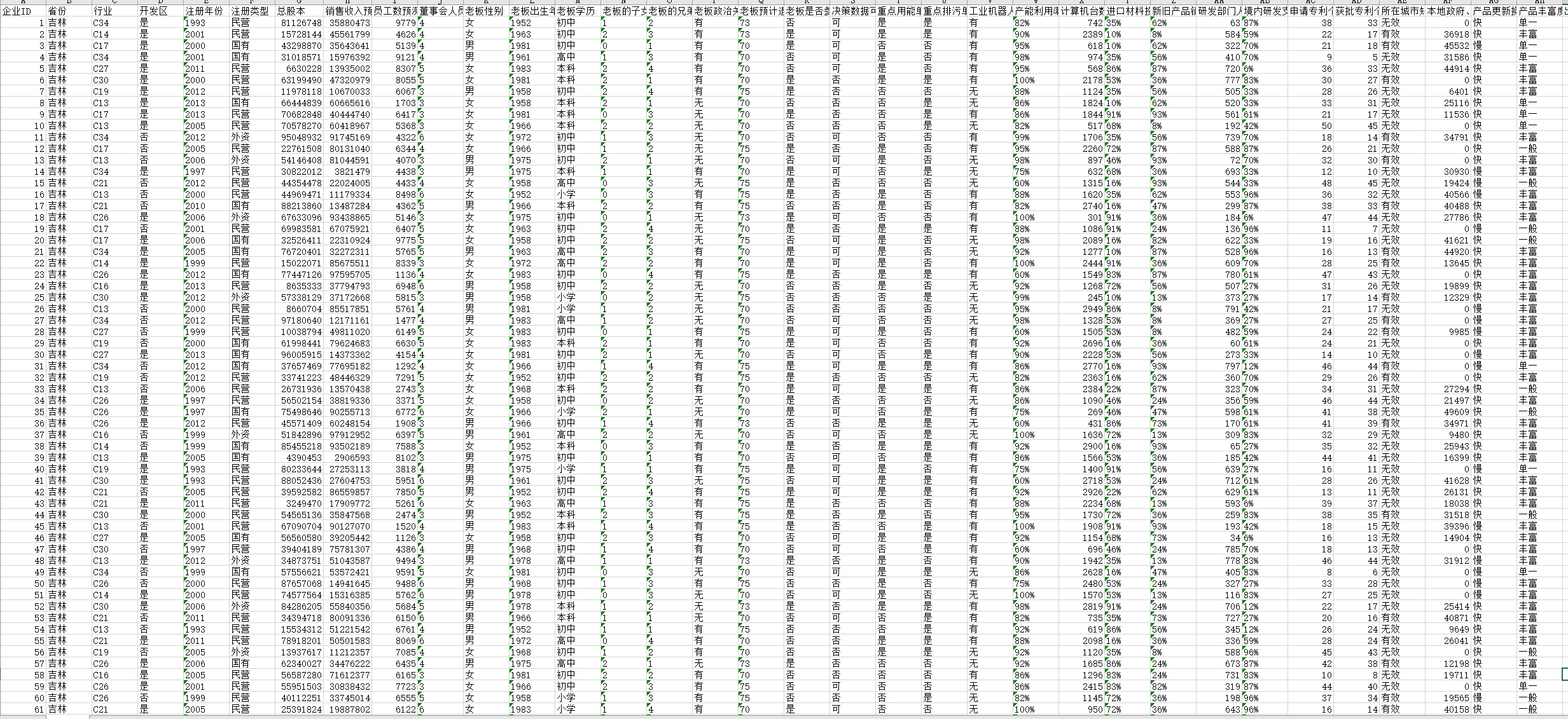 企业ID、省份、行业、开发区、注册年份、注册类型、总股本、销售收入预测、员工数预测、董事会人员、老板性别、老板出生年份、老板学历、老板的子女个数、老板的兄弟姐妹个数、老板政治关系、老板预计退休年龄、老板是否参与研发、决策数据可得性、重点用能单位、重点排污单位、工业机器人使用情况、产能利用率、计算机台数、进口材料投入比例、新旧产品销售比例、研发部门人数、境内研发支出占比、申请专利个数 获批专利个数 所在城市知识产权保护有效程度、本地政府、省级政府和中央政府创新补贴金额、产品更新换代速度、产品丰富度、出口金额、中美贸易冲突影响情况、行政审批找关系情况、女性员工占比情况、外地员工来源及占比情况、受高等教育占比、大于40岁占比、参与社会保险和福利项目占比、招工难易程度、离职率、工会经费、合同签订年限、应付账款、应收账款、银行贷款、总资产信用评级情况、营业收入、营业成本、净利润、捐赠数额、员工月平均工资、员工月平均奖金