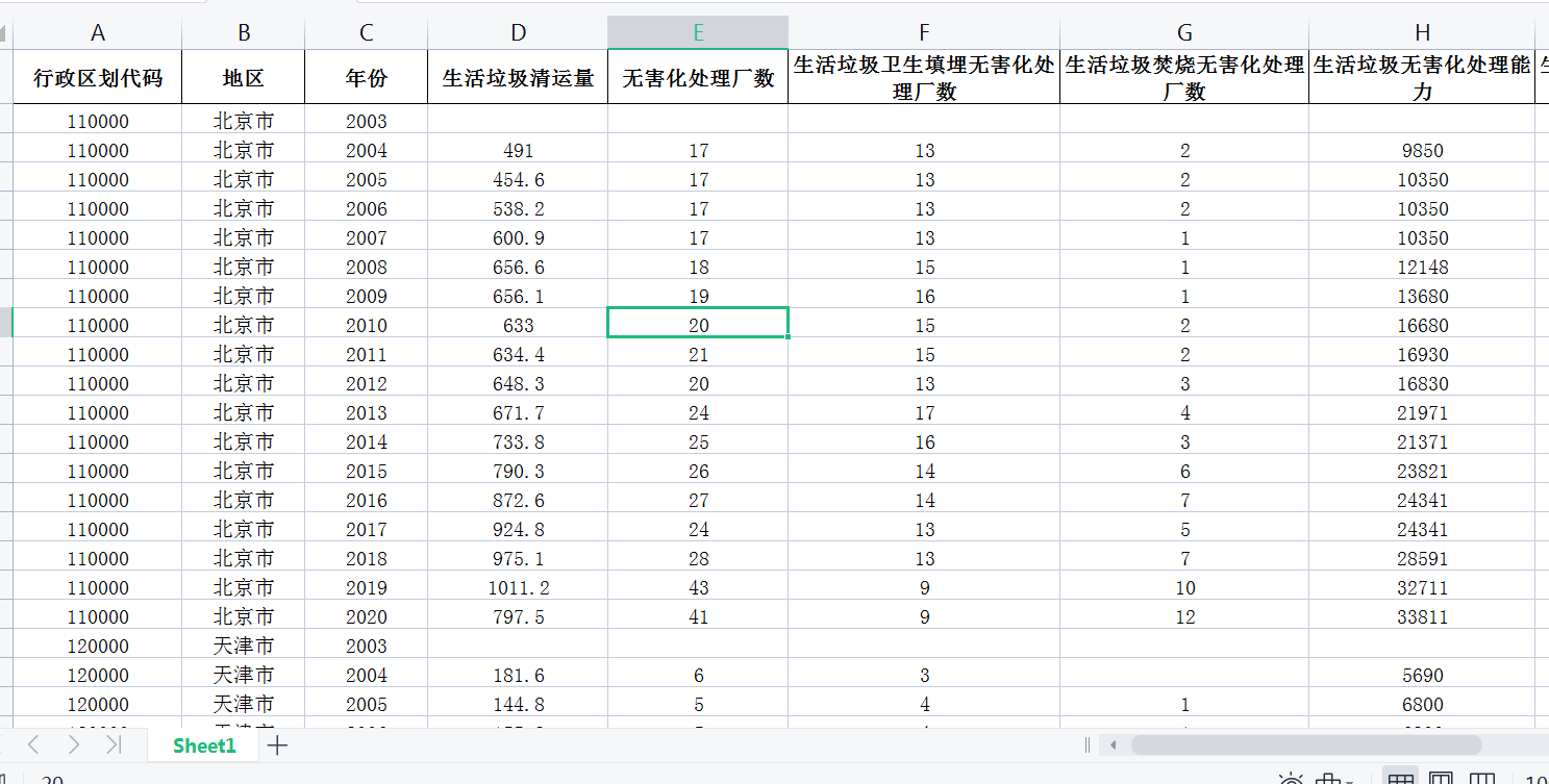 数据指标:行政区划代码、地区、年份、生活垃圾清运量、无害化处理厂数、生活垃圾卫生填埋无害化处理厂数、生活垃圾焚烧无害化处理厂数、生活垃圾无害化处理能力、生活垃圾卫生填埋无害化处理能力、生活垃圾堆肥无害化处理能力、生活垃圾焚烧无害化处理能力、生活垃圾无害化处理量、生活垃圾卫生填埋无害化处理量、生活垃圾堆肥无害化处理量、生活垃圾焚烧无害化处理量、生活垃圾无害化处理率