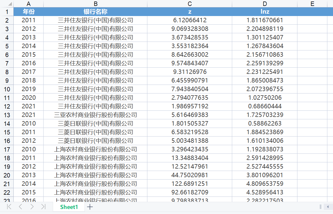 该数据为2011年至2021年国有、股份制、农商行上市非上市银行风险承担Z值数据,原始数据来自银行年报以及各大数据库整