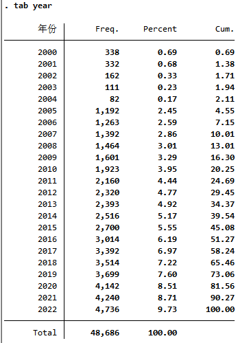 数据范围:2000 - 2022年,全部A股上市公司,共 48,686 条观测值