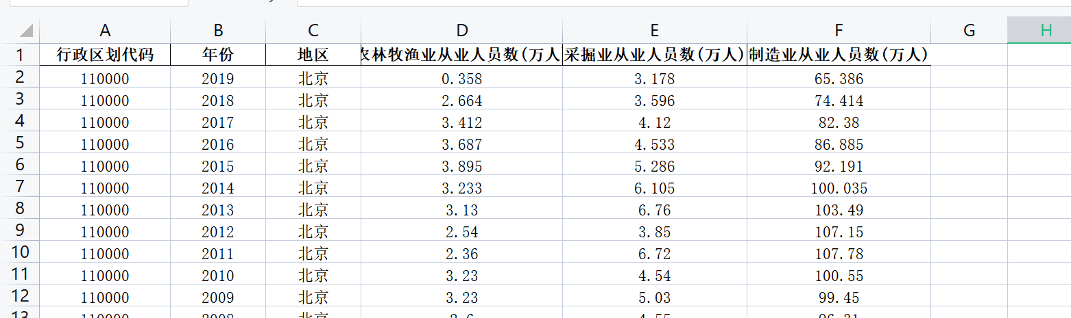 指标包括:农林牧渔业从业人员数(万人)、采掘业从业人员数(万人) 、制造业从业人员数(万人)