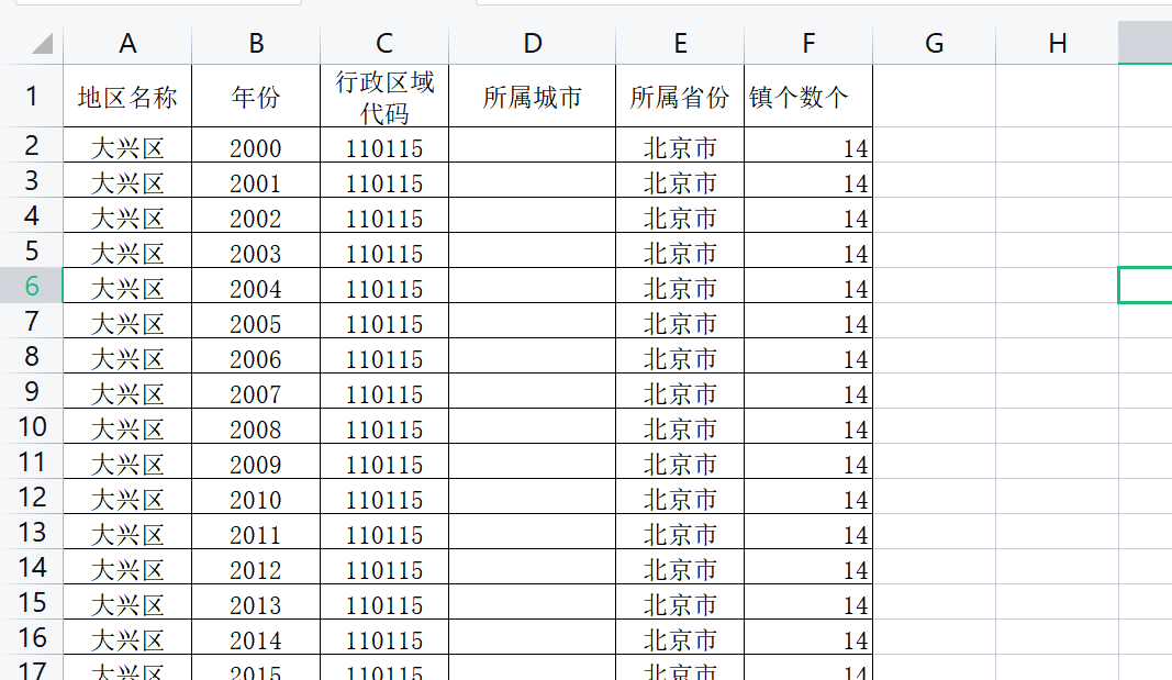 指标包括:地区名称、年份、行政区域代码、所属城市、所属省份、镇个数个