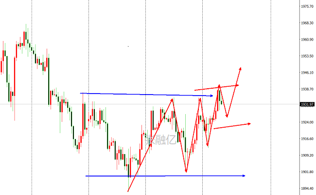 昨日黄金市场早盘开盘在1925.1美元/盎司,后行情小幅回踩1924.3美元/盎司强势拉升,日线最高触及到了1938.5美元/盎司整理,日线最终收线在了1932美元/盎司,以一根上影线较长的小阳线收线,而这样的形态收尾后,日线依旧在区间看涨。4小时图昨日探高1938稍有停顿,不过尾备收在高位,回踩1930再启稳上升。目前布林道中轨的支撑也在上移。4小时图等待蓄势放量突破。短期也是在反复试探高点阻力当中,破位才能打开空间。目前结合美元的走弱,上破的机率在加大。综上所述张融亿总结:黄金延续多头震荡,关注多头延续性,今日操作上考虑回撤布局多单为主,高空为辅,上方关注1944-1953美元阻力,下方关注1930-1920美元支撑。