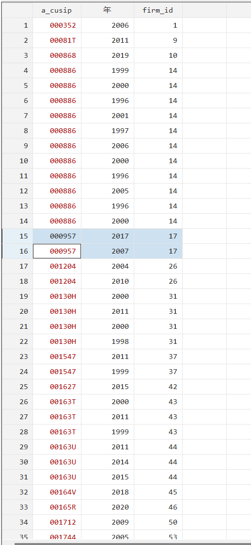 比如这里:17号公司,在2007年并购时没有并购经验,而在2017年并购时有了一起并购经验