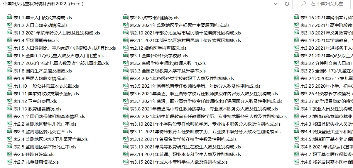 《中国妇女儿童状况统计资料2022》是一本全面反映中国妇女儿童发展现状的综合性统计资料年刊。年刊汇集了2021年中国妇女儿童事业发展情况的相关数据以及2010年以来主要年份的相关数据。二、《中国妇女发展纲要(2021-2030年)》和《中国儿童发展纲要(2021-2030年)》实施后,本年刊在版面上作了相应调整。年刊整体框架不变,仍然包括人口与经济、卫生保健、教育、就业与社会保障、社会服务、社会参与、科技、体育、法律保护、生活和社会环境以及分地区统计资料等十一个章节,增减了部分内容。年刊后附有主要统计指标解释。三、年刊资料主要来源于各相关部门的统计年报和统计年鉴、国家统计局相关统计资料,以及相关的专项调查统计资料。四、年刊涉及的各项统计数据除森林资源外均未包括香港、澳门特别行政区和台湾省数据。五、年刊中东部地区包括:北京、天津、河北、上海、江苏、浙江、福建、山东、广东和海南。中部地区包括:山西、安徽、江西、河南、湖北和湖南。西部地区包括:内蒙古、广西、重庆、四川、贵州、云南、西藏、陕西、甘肃、青海、宁夏和新疆。东北地区包括:辽宁、吉林和黑龙江。六、年刊中部分数据的合计数或相对数由于四舍五入及计量单位取舍不同可能会产生计算误差,均未作机械调整;“#”表示其中主要项;“空格”表示数据为0、数据不详或没有数据;“…”表示数据不足该表最小单位。
