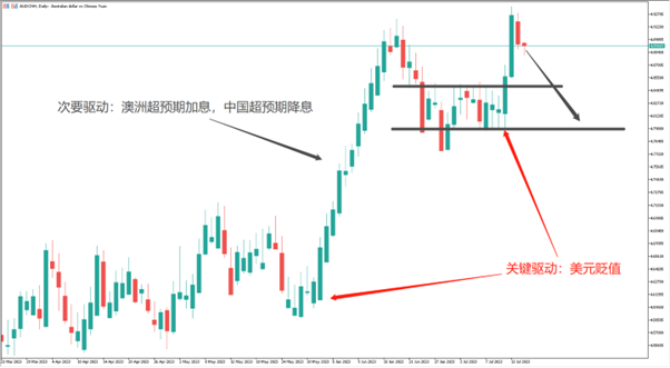 受到国债利率直接驱动的便是人民币的汇率,因此人民币中短线有较大的升值空间。相比之下,澳元受美元影响,有超涨影响。从澳元兑人民币日线图来看,两次汇率的大涨均受到美元贬值的影响。虽然长线基本面不利于美元,但美元当前的超跌现象也给予美元反弹的空间。整体来看,交易策略应该以逢高做空为主,现价上方的阻力在4.9-4.93的前高点关口。现价下方的技术面支撑分别在4.85和4.8的震荡区域上下沿。如果汇率跌破4.8大关,则基本面支撑可以关注4.7关口。