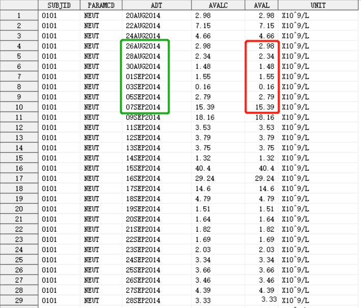 具体题目如下求:中性粒细胞(NEUT)观测值小于3 最大的持续时间。“求出每一个受试者中性粒细胞 (NEUT) 观测值小于 3的持续日期的最大值如果在观测值小于3到恢复正常(AVAL>=3)期间检查值出现缺失,则缺失值默认为小于3。