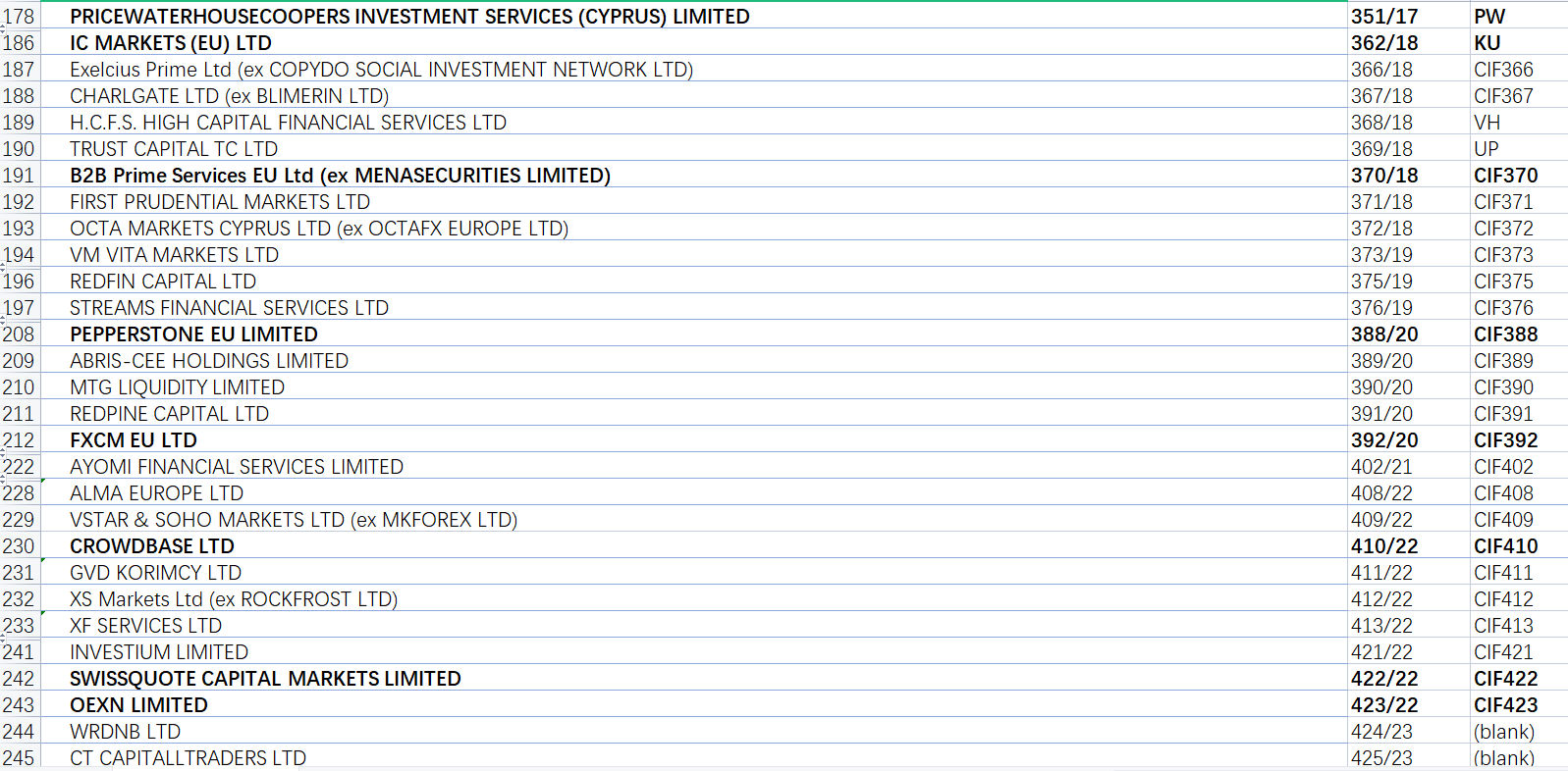 在过去几年中,FXCM、Investium、OEXN、Swissquote等知名金融公司均获得了CySEC的牌照。 尤其注意的是,许多澳大利亚本土经纪商如Pepperstone、IC Markets也纷纷申请成为CySEC CIF。