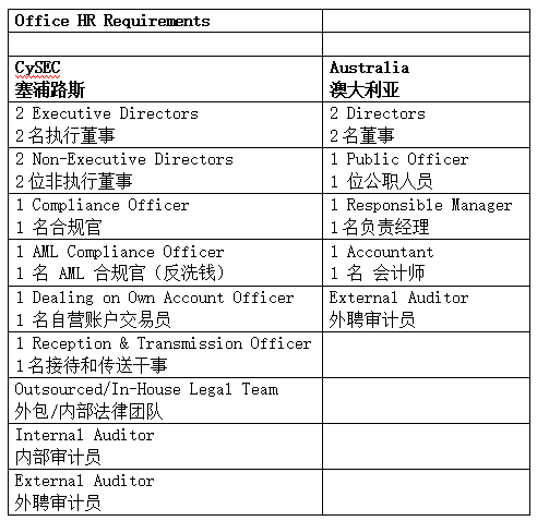 塞浦路斯证券交易委员会正密切监控在塞浦路斯注册的经纪商的活动,强制要求塞浦路斯运营的实体办事处必须设有风险部门、运营部门、主管、销售部门以及法律合规部门。 这些做法在澳大利亚等司法管辖区较为宽松,因澳大利亚证券和投资委员会(ASIC)监管机构要求实际办事处的员工人数较少。