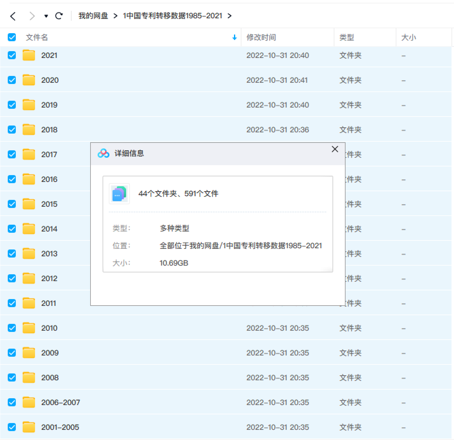 2-通过“专利申请权、专利权的转移”来检索保存,来源可靠,数据较庞大 [ 时间跨度1985-2021年 (会不定期更新数据年份),约300w+条专利转移数据 (因数据库实时更新,每年的实际导出数据量与数据库显示存在微小差距,但对研究影响不大)。还包括专利质押、专利许可数据。详细如下图。]
