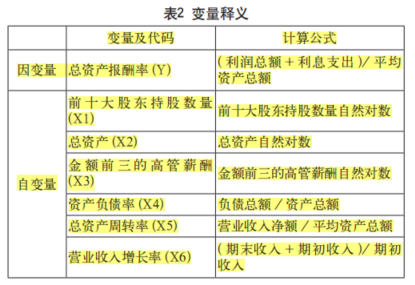 因变量为总资产报酬率(Y)、自变量为前十大股东持股数量(X1)、总资产(X2)、金额前三的高管薪酬(X3)、资产负债率(X4)、总资产周转率(X5)、营业收入增长率(X6)