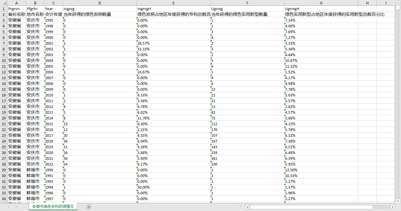 省份名称 地市名称 会计年度 当年获得的绿色发明数量 绿色发明占地区年度获得的专利总数百分比 当年获得的绿色实用新型数量 绿色实用新型占地区年度获得的实用新型总数百分比