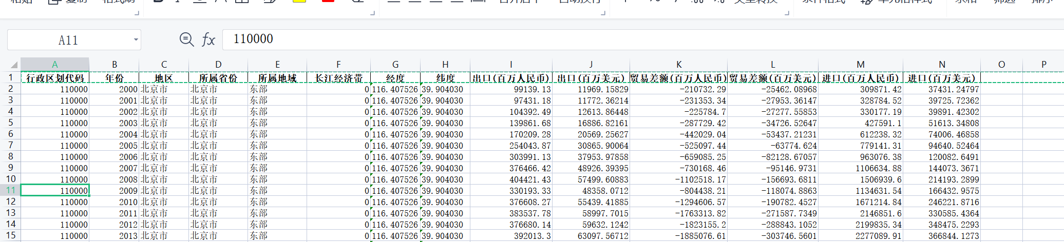 指标包括:行政区划代码、年份、地区、所属省份、所属地域、长江经济带、经度、纬度 出口(百万人民币)、出口(百万美元)、贸易差额(百万人民币)、贸易差额(百万美元)、进口(百万人民币)、进口(百万美元)