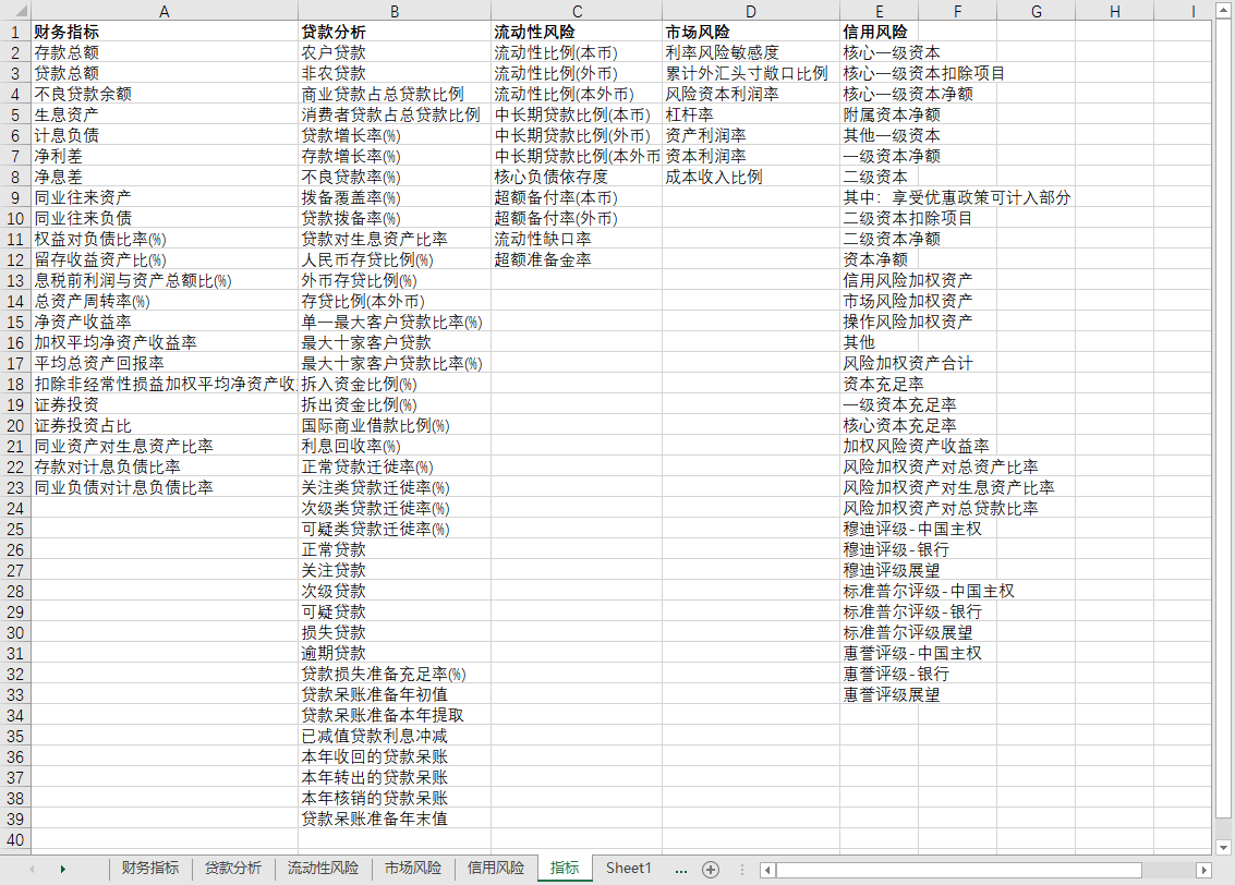存款总额/贷款总额/不良贷款余额/生息资产/计息负债/净利差/净息差/同业往来资产/同业往来负债/权益对负债比率(%)/留存收益资产比(%)/息税前利润与资产总额比(%)/总资产周转率(%)/净资产收益率/加权平均净资产收益率/平均总资产回报率/扣除非经常性损益加权平均净资产收益率/证券投资/证券投资占比/同业资产对生息资产比率/存款对计息负债比率/同业负债对计息负债比率/农户贷款/非农贷款/商业贷款占总贷款比例/消费者贷款占总贷款比例/贷款增长率(%)/存款增长率(%)/不良贷款率(%)/拨备覆盖率(%)/贷款拨备率(%)/贷款对生息资产比率/人民币存贷比例(%)/外币存贷比例(%)/存贷比例(本外币)/单一最大客户贷款比率(%)/最大十家客户贷款/最大十家客户贷款比率(%)/拆入资金比例(%)/拆出资金比例(%)/国际商业借款比例(%)/利息回收率(%)/正常贷款迁徙率(%)/关注类贷款迁徙率(%)/次级类贷款迁徙率(%)/可疑类贷款迁徙率(%)/正常贷款/关注贷款/次级贷款/可疑贷款/损失贷款/逾期贷款/贷款损失准备充足率(%)/贷款呆账准备年初值/贷款呆账准备本年提取/已减值贷款利息冲减/本年收回的贷款呆账/本年转出的贷款呆账/本年核销的贷款呆账/贷款呆账准备年末值/流动性比例(本币)/流动性比例(外币)/流动性比例(本外币)/中长期贷款比例(本币)/中长期贷款比例(外币)/中长期贷款比例(本外币)/核心负债依存度/超额备付率(本币)/超额备付率(外币)/流动性缺口率/超额准备金率/利率风险敏感度/累计外汇头寸敞口比例/风险资本利润率/杠杆率/资产利润率/资本利润率/成本收入比例/核心一级资本/核心一级资本扣除项目/核心一级资本净额/附属资本净额/其他一级资本/一级资本净额/二级资本/其中:享受优惠政策可计入部分/二级资本扣除项目/二级资本净额/资本净额/信用风险加权资产/市场风险加权资产/操作风险加权资产/其他/风险加权资产合计/资本充足率/一级资本充足率/核心资本充足率/加权风险资产收益率/风险加权资产对总资产比率/风险加权资产对生息资产比率/风险加权资产对总贷款比率/穆迪评级-中国主权/穆迪评级-银行/穆迪评级展望/标准普尔评级-中国主权/标准普尔评级-银行/标准普尔评级展望/惠誉评级-中国主权/惠誉评级-银行/惠誉评级展望/