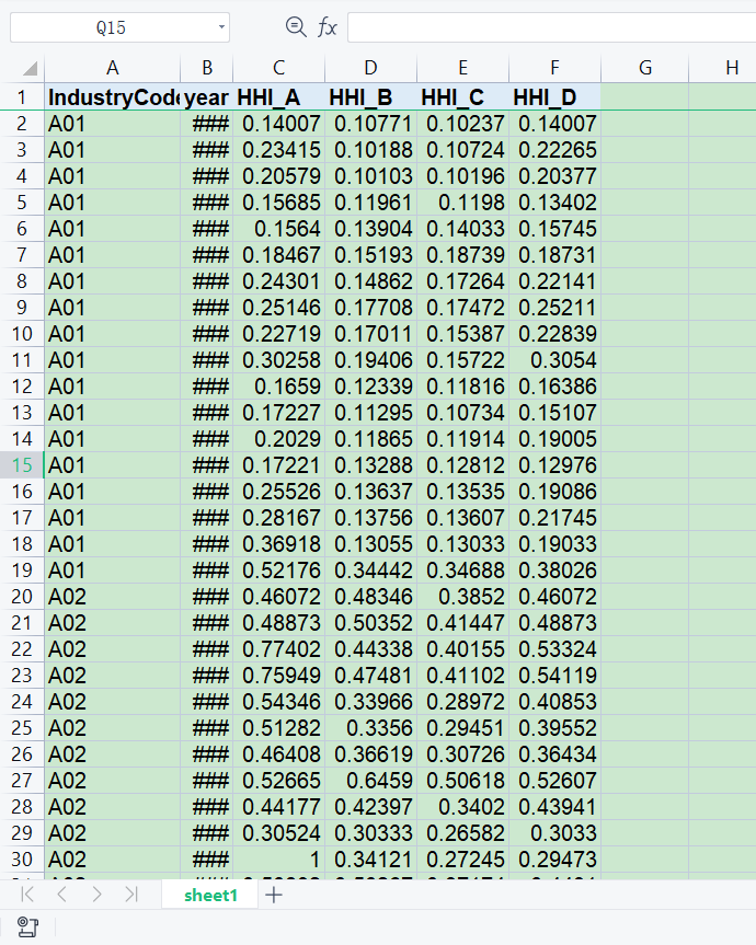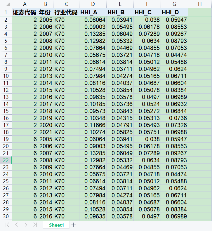 HHI_ A [HHI(A)] -计算公式为: HHI=sum[ (Xi/X)^2],以下四个指标的计算中使用了不同的指标x代入计算。利用单个公司主营业务收入计算其所占行业市场份额。其中,xi为单个公司的主营业务收入,x为该公司所属行业的主营业务收入合计,(Xi/X)即为该公司所占的行业市场份额。即为行业内的每家公司的主营业务收入与行业主营业务收入合计的比值的平方累加。