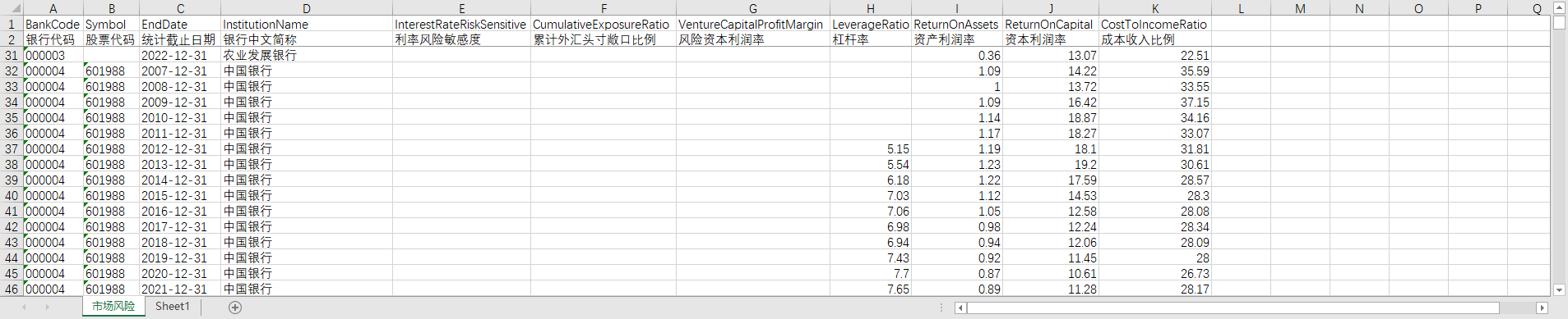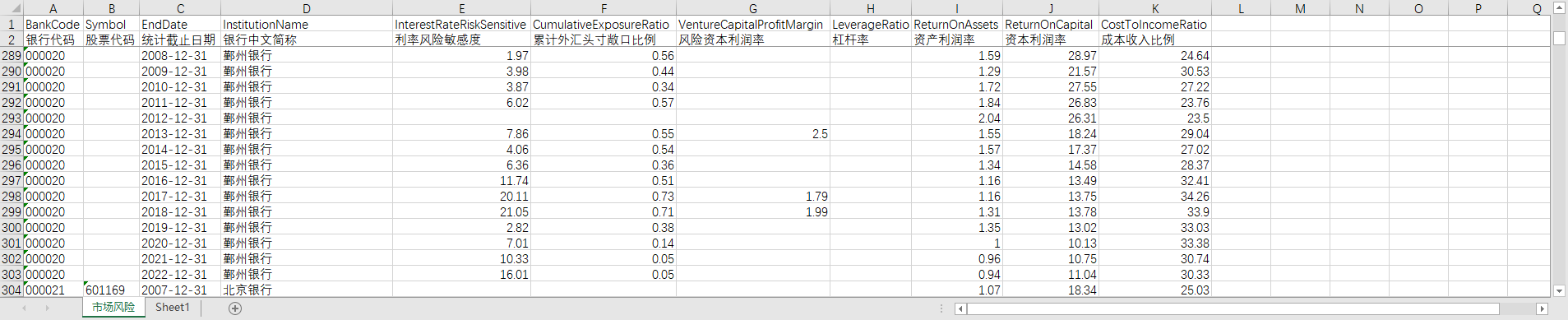 银行代码 股票代码 统计截止日期 银行中文简称 利率风险敏感度 累计外汇头寸敞口比例 风险资本利润率 杠杆率 资产利润率 资本利润率 成本收入比例