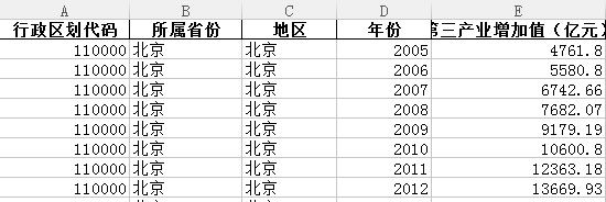 指标包括:行政区划代码、 所属省份 、 地区 、年份 、 第三产业增加值(亿元) 、 第二产业增加值(亿元)、 地区生产总值(亿元) 、 第二产业比重 、第三产业比重。