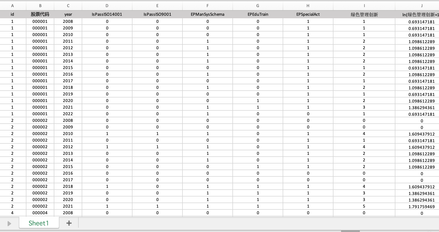 绿色管理创新主要指标:股票代码、年份、ISO14001认证、ISO9001 认证,环保管理制度体系、环保教育与培训、环保专项行动、绿色管理创新、绿色管理创新的对数